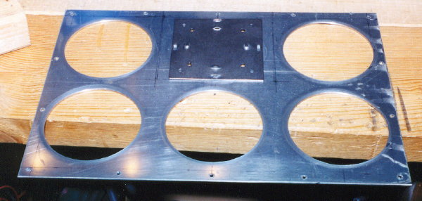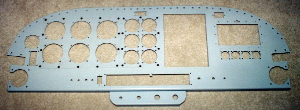 cut. The top middle hole is occupied by a jig helping me drill the instrument mounting screw holes. |